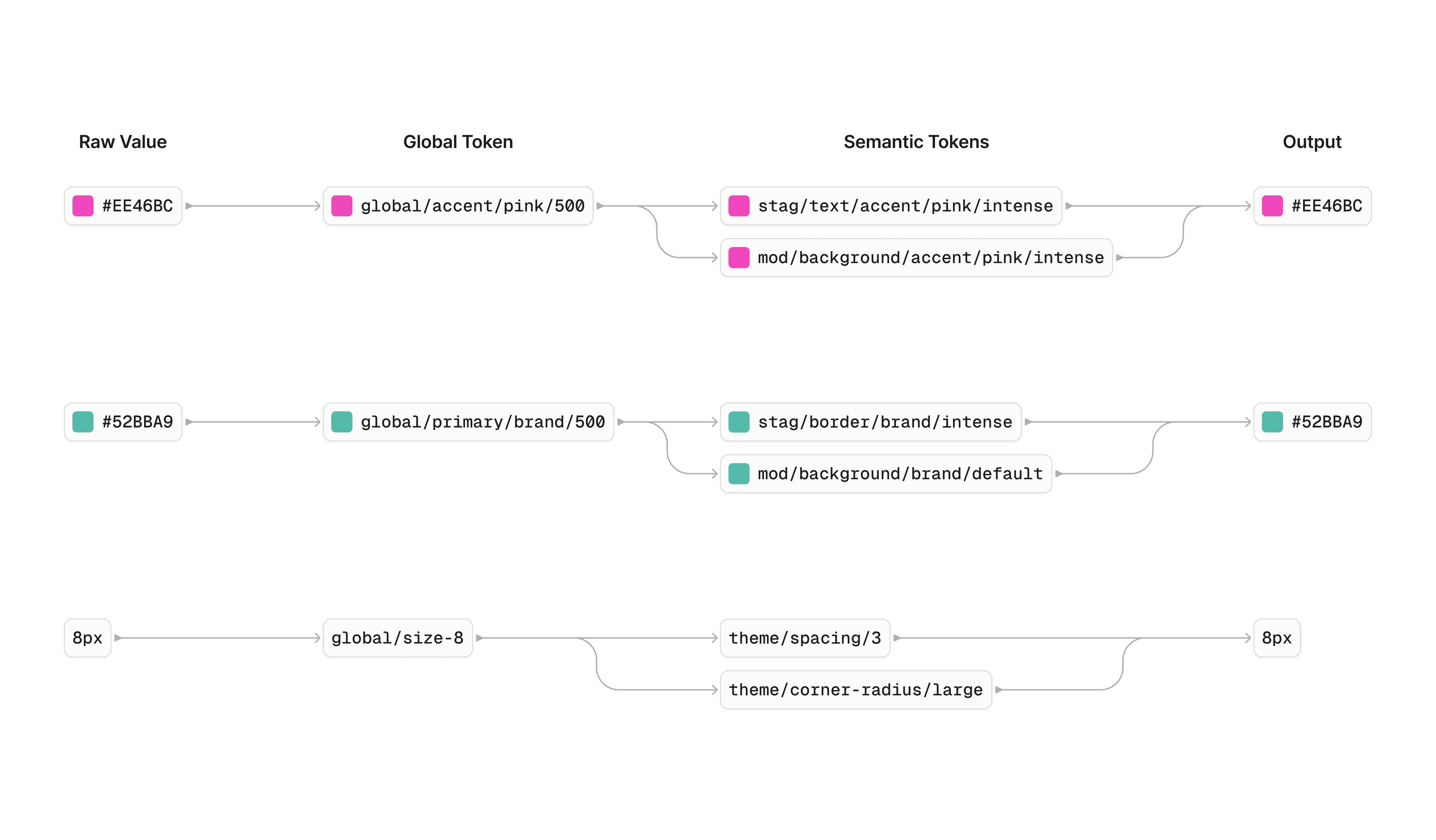 These categories were designed to communicate the behavioral nature of UI elements. Specifically, whether an object was interactive or not. Stage tokens were used for static, non-interactive elements and Mode was used for interactive elements.
